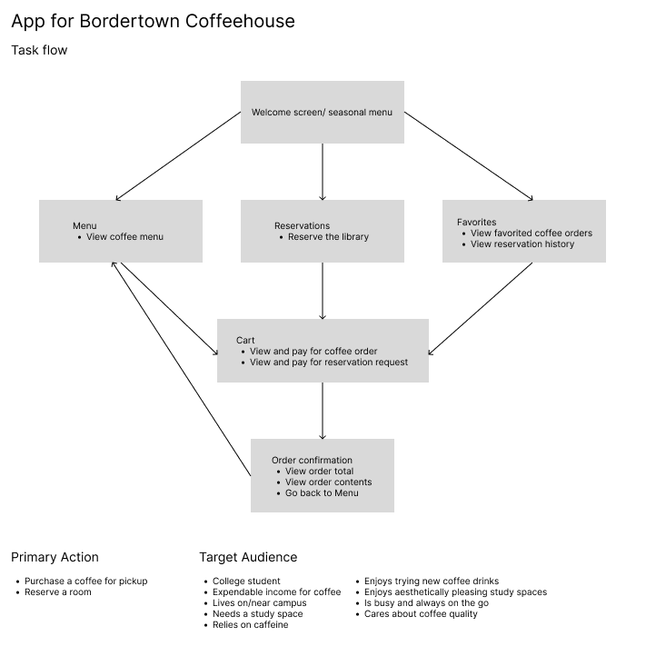 Inspired by love of coffee and coffee culture, I created an app for the local Minneapolis cafe, Bordertown Coffeehouse. This cafe is an affordable, comfortable, and relaxing environment for students and locals alike. A key part of the Dinkytown community for over 20 years, I hoped to draw in more customers with the creation of an online ordering app with familiar navigation but a look and feel that represented Bordertown’s unique charm.