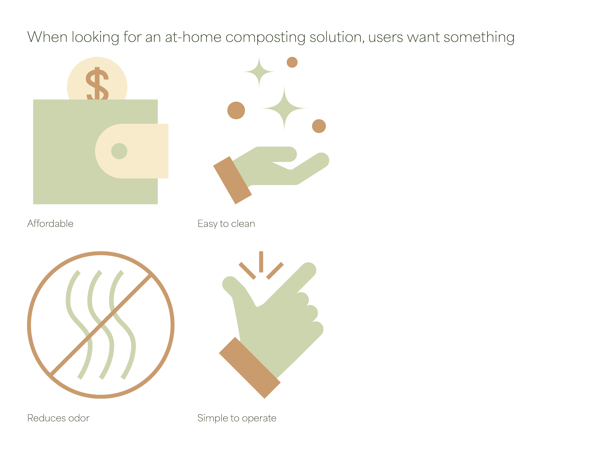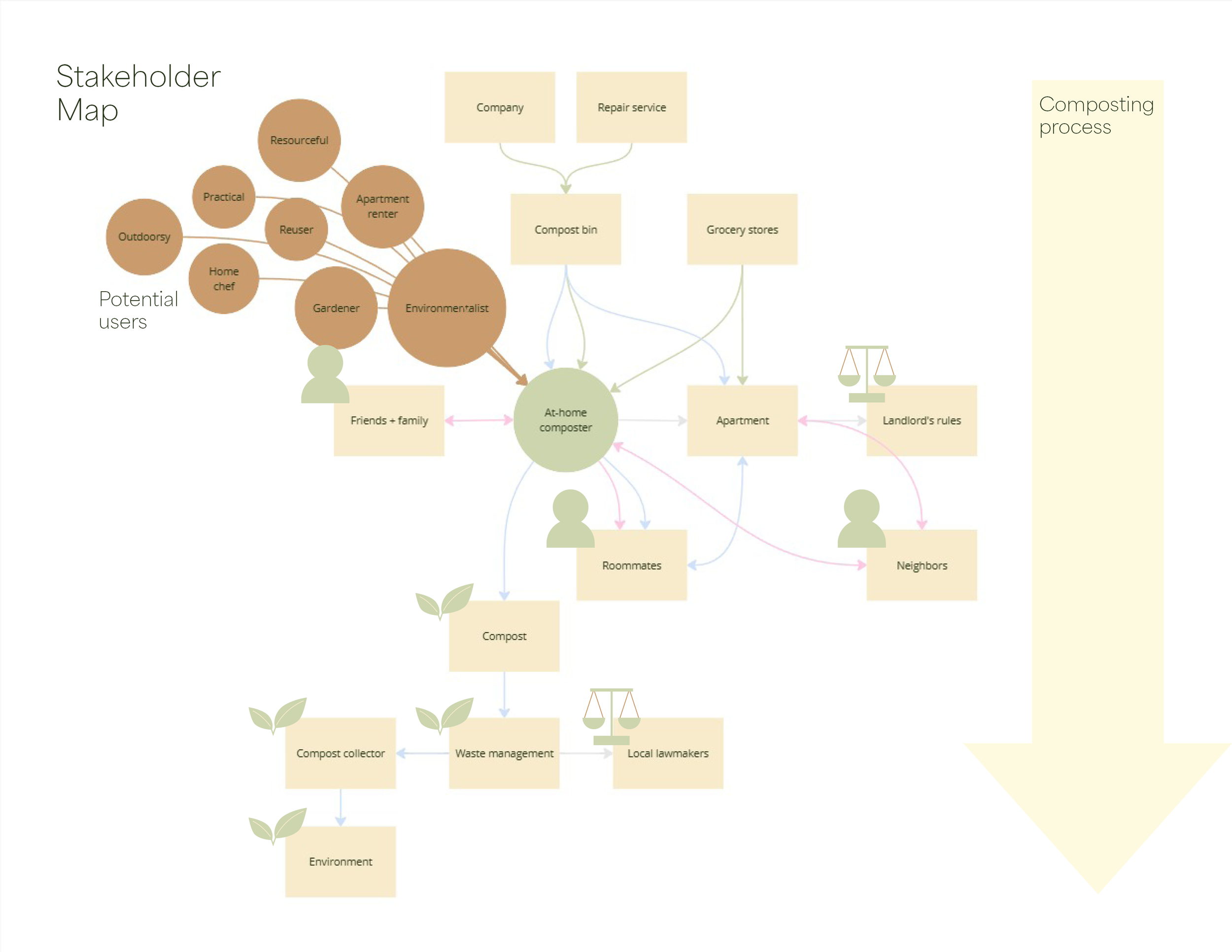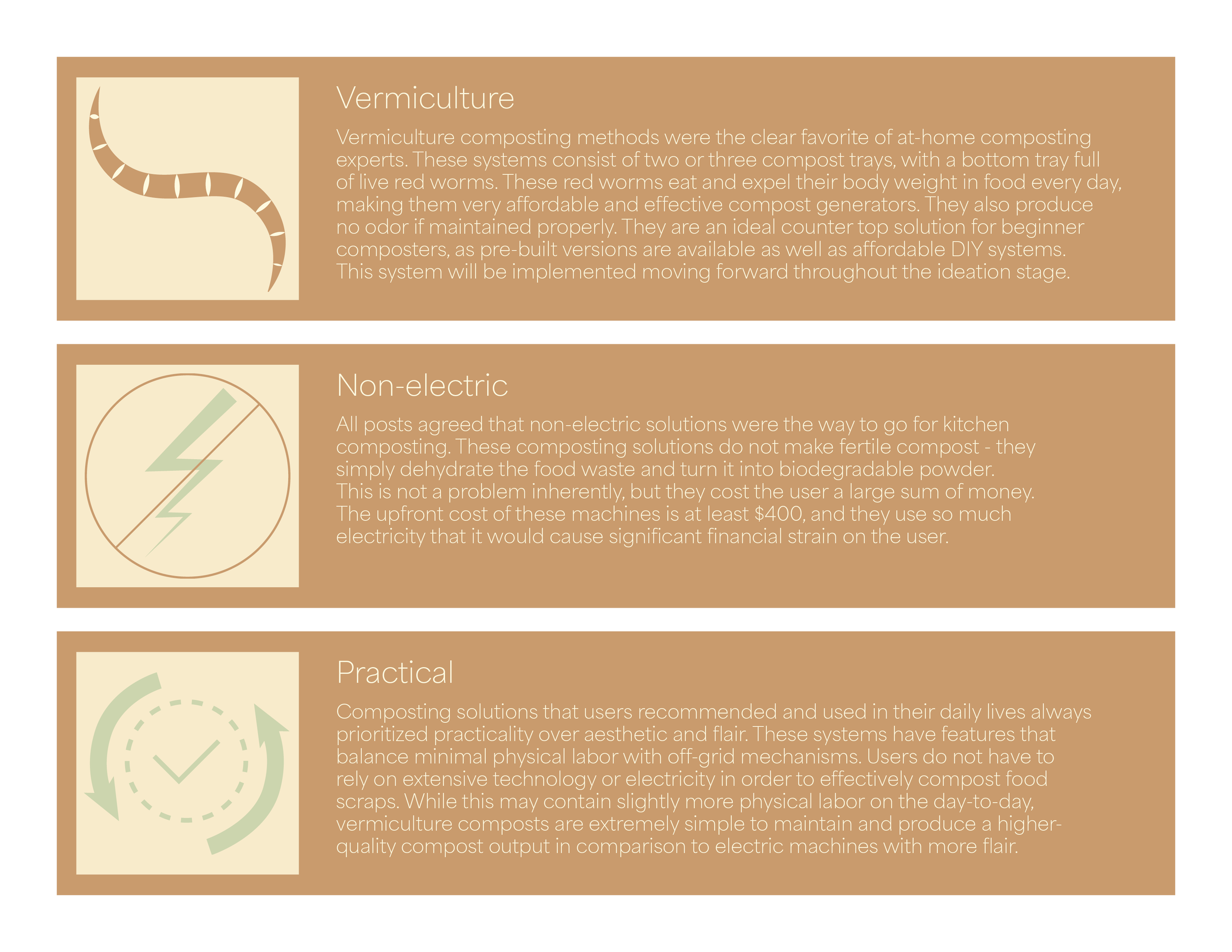 By thoroughly implementing extensive design research methodology techniques, I found an effective solution to the urban composter’s needs. I learned how to effectively analyze user research data, format findings effectively, and to pay attention to details.