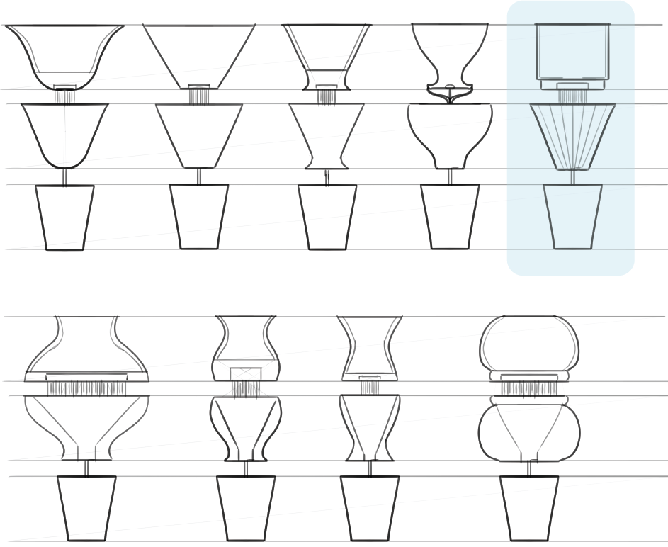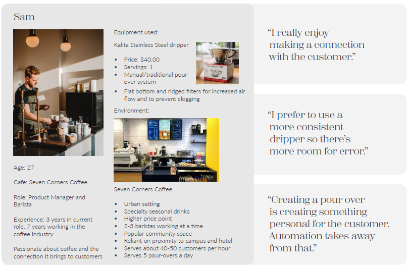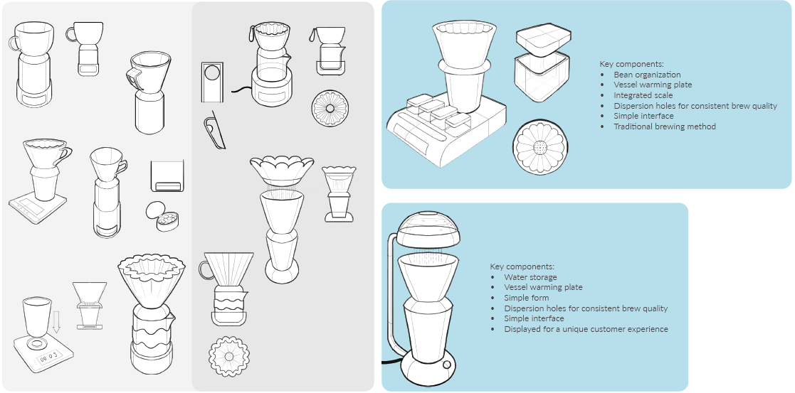 My experience working in specialty coffee and love for user research came together to create the Pendant Pour-Over. This system aimed to maintain the personal connection a pour-over coffee provides, while allowing the barista to multitask on other orders. Balancing tradition with functionality proved to be a challenge, but with effective user research, a plethora of form ideation, and evocative CAD renderings, the Pendant Pour-Over was able to keep the personal touch of a pour-over and reduce the task load on busy baristas.